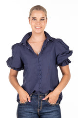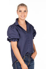 Classic and timeless, classic navy coloured linen combines with covered buttons and a puffy short sleeve to create the perfect summer dress shirt. Generously cut for comfort, this is country style at its very best. Elasticised cuffs. Full button through front.