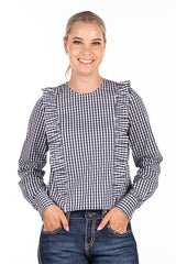 This top is tailored from a comfortable stretch cotton blend fabric. Frills front and back with long sleeves and two button cuff closure.