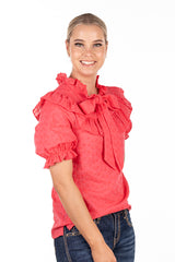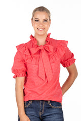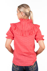 Cute frills front and back with a tie front, this top is tailored from 100% cotton broderie anglaise fabric. Elasticised, short frill sleeve.