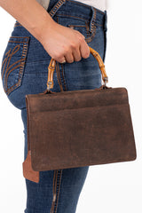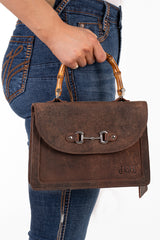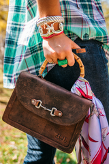A new design for Hitchley and Harrow, the bamboo handle bag is a unique design while still being super functional for carrying all your everyday essentials. Handcrafted from a custom developed leather, this bag is super durable and features a tiny bit embellishment and custom bamboo handle. Fully lined with a folding top clip closure, this is a great smaller sized handbag. External H&H Branding. Fully adjustable, removable shoulder strap. Internal YKK zippered pocket x 1 and open top pocket x 1. Pictured in mocca coloured leather.