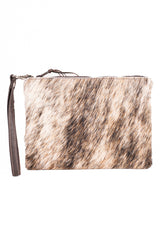100% Australian made and lined in our very own H&H cotton shirt fabrics, these hide-on and leather clutches are the "go to" bag for everyday use or a weekend out. Top single YKK zipper closure with leather pull and leather wrist strap. Features an internal side pocket. Hide front and leather back.