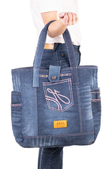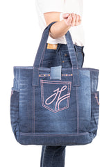 Short reinforced, double layer denim over the shoulder straps to carry with ease. Denim latch with snap closure for easy inside access and lined with custom embossed lining featuring the H&H logo. Zippered internal pockets on one side along with two open pockets for easy access to your phone and keys. This exclusive denim tote bag also features six external open end pockets for stashing your everyday essentials. All our zips are genuine YKK quality.