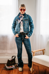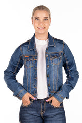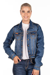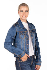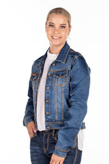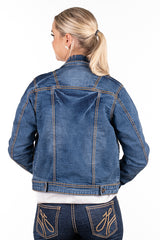 A classic denim jacket is the perfect addition to your trans-seasonal wardrobe. Tailored from a stretch denim, this jacket allows you to move with ease. Longer arm allowance with cropped body length to sit perfectly at the waist. Darker wash denim look with heavy tan stitching.