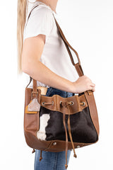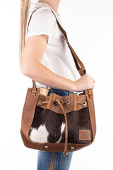 Produced exclusively for H&H, this new style hide and leather combination bag is a super versatile piece. Use with short handles or add the long strap to carry on the shoulder. Fully lined with custom H&H cotton lining featuring two pockets and a zippered pocket for secure storage of personal items. Elasticised top pockets in the corner to store personal items or a small water bottle. Metal 'D' to attach keys to. Metal feet to protect the leather underside of the bag. Top closure is a leather drawstring.