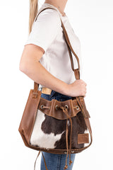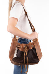 Produced exclusively for H&H, this new style hide and leather combination bag is a super versatile piece. Use with short handles or add the long strap to carry on the shoulder. Fully lined with custom H&H cotton lining featuring two pockets and a zippered pocket for secure storage of personal items. Elasticised top pockets in the corner to store personal items or a small water bottle. Metal 'D' to attach keys to. Metal feet to protect the leather underside of the bag. Top closure is a leather drawstring.