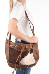 Produced exclusively for H&H, this new style hide and leather combination bag is a super versatile piece. Use with short handles or add the long strap to carry on the shoulder. Fully lined with custom H&H cotton lining featuring two pockets and a zippered pocket for secure storage of personal items. Elasticised top pockets in the corner to store personal items or a small water bottle. Metal 'D' to attach keys to. Metal feet to protect the leather underside of the bag. Top closure is a leather drawstring.