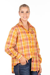 Tailored from a statement burgundy, orange and yellow 100% lightweight cotton fabric, this relaxed fit, full button through shirt is comfortable and classic. Single button cuff closure and an option to tab the sleeve up. Longer sleeve and body allowance for a great fitting shirt. H&H embroidery front left front pocket, plain right front pocket.