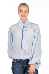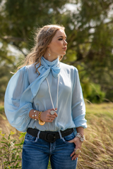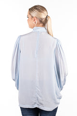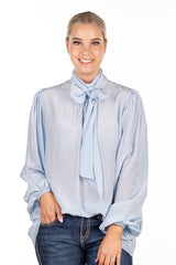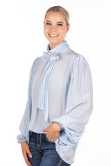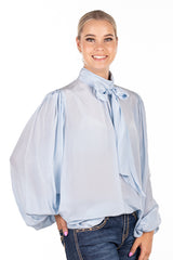 Classic and timeless, this beautiful garment is gathered at the chest and tops of the shoulders to create a delicate feminine silhouette. Tailored from a soft baby blue silk blend fabric featuring a folded collar and seperate neck tie. Elastic cuff that can be worn down or pushed up.
