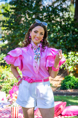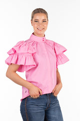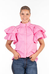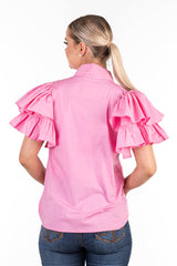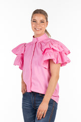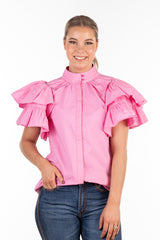 Crafted from a stretch cotton fabric, this standout shirt is the ultimate head-turner. It can be effortlessly tucked into jeans for a chic look or left out over skinny jeans with flats for a relaxed vibe. The feature of this garment is the stunning layered volume frill sleeve. Gathered neckline and double button closure front neck. Full button through. This top is roomy and relaxed in its cut. Models wear XXS.