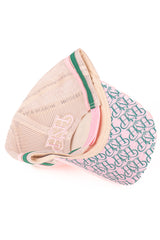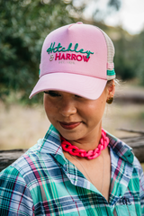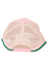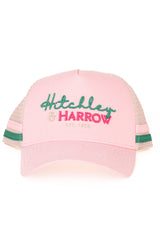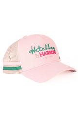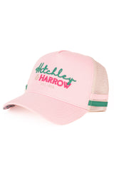 Another NEW trucker cap for your collection! Beige coloured mesh and pink cotton drill front panel and peak featuring emerald and hot pink embroidery. H&H logo under the peak. Pale pink plastic snap closure at the back. Limited edition colour release.
