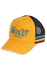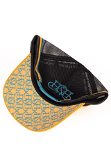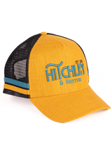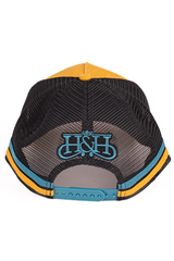 Another NEW trucker cap for your collection! Black coloured mesh, mustard linen front panel and peak featuring turquoise embroidery. The H&H logo print under the peak creates a very eye catching piece! Turquoise plastic snap closure at the back. Limited edition colour release.
