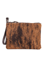 100% Australian made and lined in our very own H&H cotton shirt fabrics, these hide-on and leather clutches are the "go to" bag for everyday use or a weekend out. Top single YKK zipper closure with leather pull and leather wrist strap. Features an internal side pocket. Hide front and leather back.