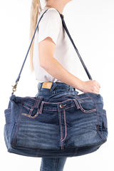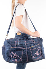 Long denim strap with an adjustable buckle for extra length, backed with webbing for extra strength. Short, double denim layered handles for an easy throw over the shoulder. This denim exclusive includes six open end, external pockets and one zippered internal pocket for extra storage. Double access top zippers. All our zips are genuine YKK quality.