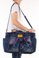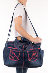 Constructed from up-cycled H&H jeans these nappy bags have a multitude of internal elasticised pockets and a seperate internal central zippered divider. All our zips are genuine YKK quality and the bags are fully lined with custom H&H lining. Open end pockets x 2 for quick access to your keys and phone. Long over the shoulder handles and a removable shoulder strap as standard. Throw over your shoulder or hook onto the handles of your pram to access the contents of the bag efficiently.