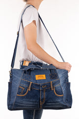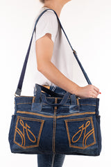 Constructed from up-cycled H&H jeans these nappy bags have a multitude of internal elasticised pockets and a seperate internal central zippered divider. All our zips are genuine YKK quality and the bags are fully lined with custom H&H lining. Open end pockets x 2 for quick access to your keys and phone. Long over the shoulder handles and a removable shoulder strap as standard. Throw over your shoulder or hook onto the handles of your pram to access the contents of the bag efficiently.