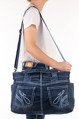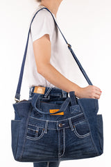 Constructed from up-cycled H&H jeans these nappy bags have a multitude of internal elasticised pockets and a seperate internal central zippered divider. All our zips are genuine YKK quality and the bags are fully lined with custom H&H lining. Open end pockets x 2 for quick access to your keys and phone. Long over the shoulder handles and a removable shoulder strap as standard. Throw over your shoulder or hook onto the handles of your pram to access the contents of the bag efficiently.