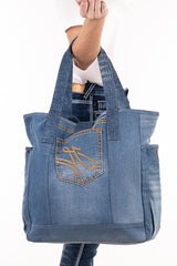 Short reinforced, double layer denim over the shoulder straps to carry with ease. Denim latch with snap closure for easy inside access and lined with custom embossed lining featuring the H&H logo. Zippered internal pockets on one side along with two open pockets for easy access to your phone and keys. This exclusive denim tote bag also features six external open end pockets for stashing your everyday essentials. All our zips are genuine YKK quality.