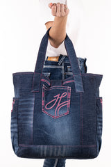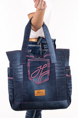 Short reinforced, double layer denim over the shoulder straps to carry with ease. Denim latch with snap closure for easy inside access and lined with custom embossed lining featuring the H&H logo. Zippered internal pockets on one side along with two open pockets for easy access to your phone and keys. This exclusive denim tote bag also features six external open end pockets for stashing your everyday essentials. All our zips are genuine YKK quality.