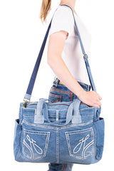 Constructed from up-cycled H&H jeans these nappy bags have a multitude of internal elasticised pockets and a seperate internal central zippered divider. All our zips are genuine YKK quality and the bags are fully lined with custom H&H lining. Open end pockets x 2 for quick access to your keys and phone. Long over the shoulder handles and a removable shoulder strap as standard. Throw over your shoulder or hook onto the handles of your pram to access the contents of the bag efficiently.