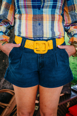 Your favourite denim shorts in a dark wash! Offered in two lengths, these shorts are stylish and comfortable. Able to be dressed up or kept super casual, these are an absolute 'must have' for the warmer months. Double belt loops and back welt pockets. Stretch denim. Darker denim with self blue coloured stitching. DS-1 are the shorter length.