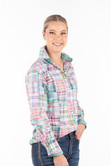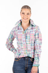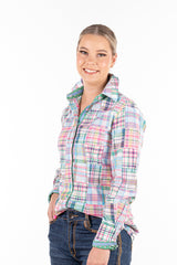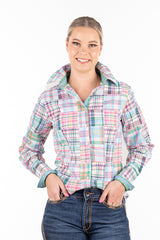 Our collared Arena shirt is a classic style with unmistakable H&H fit and finishings. The shirt is manufactured from an absolute statement, detailed patchwork check featuring pale pink, emerald and mint greens, lemon, light blue and white. The cuffs and placket are trimmed with a custom printed pale pink and emerald green polka dot fabric and finished with pale blue grosgrain ribbon. Longer sleeve and body allowance for a perfect fit. Full button though garment with 5", 4 button cuff. Non stretch, patchwork, 100% cotton fabric.