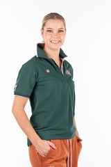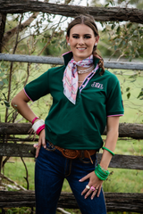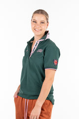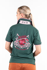 Another super comfortable all year round option from H&H, this new release, loose fitting polo is offered in a hunter green base fabric with pink and white striped contrast fabric. The back design features the H&H polo stick embroidered logo. Custom woven collar, cuffs and embellishments. Cut on a straight side seam, the EL polo range offers more generous patterning for ultimate comfort. High quality, 320 gsm stretch french terry fabric.