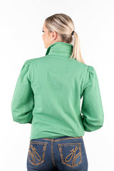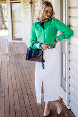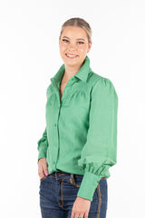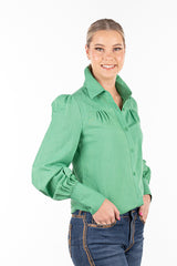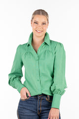 Reliably timeless, this gathered front detail shirt is perfectly at home with a tailored skirt, shorts or jeans. Crafted from a custom woven cotton/linen fabric, this shirt is super classic. Easily transitioned from formal to casual, this shirt features gathering at the cuff, shoulder and front yoke. 4.5", 3 button cuff closure. H&H embroidery under the collar.