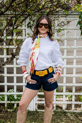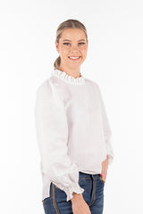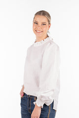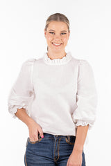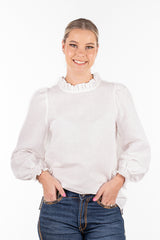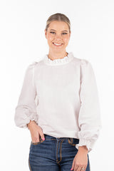 Crafted from a custom cotton/linen blended fabric and with a roomy design, this top can be effortlessly tucked into jeans for a chic look or left out over skinny jeans with flats for a relaxed vibe. The shirred elastic cuff with a frill on a longer sleeve allowance provides versatility, allowing you to wear the sleeves down or scrunched up. The gathered linen frill neckline and gentle puff sleeve add a touch of femininity to the design. This top is roomy and generous in cut, ensuring both style and comfort.