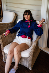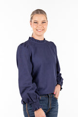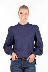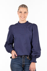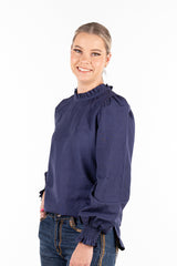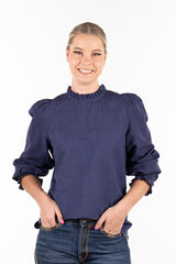 Crafted from a custom cotton/linen blend fabric and with a roomy design, this top can be effortlessly tucked into jeans for a chic look or left out over skinny jeans with flats for a relaxed vibe. The shirred elastic cuff with a frill on a longer sleeve allowance provides versatility, allowing you to wear the sleeves down or scrunched up. The gathered frill neckline and gentle puff sleeve add a touch of femininity to the design. This top is roomy and generous in cut, ensuring both style and comfort.