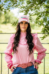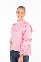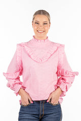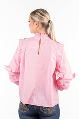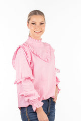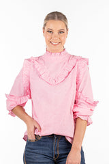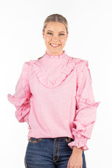 Teaming frills and pale pink broderie anglaise fabric, this top is so versatile you'll be reaching for it on repeat throughout the year! Long sleeves are able to be pushed up your arm with the elasticised cuff. Single button closure at the back of the garment.