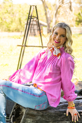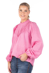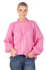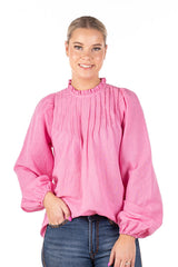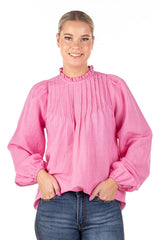 Crafted from a candy pink coloured linen fabric, this classic shirt exudes timeless elegance. It can be effortlessly tucked into jeans for a chic look or left out over skinny jeans with flats for a relaxed vibe. Long full sleeve with an elastic cuff. The pin tucked neckline is a standout design feature. This top is roomy and relaxed in its cut. Model wears XXS.