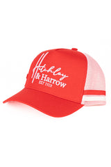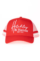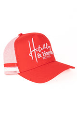 Another NEW trucker cap for your collection! Baby pink coloured mesh and red cotton drill front panel and peak featuring baby pink embroidery. Features the H&H logo under the peak. Red plastic snap closure at the back. Limited edition colour release.