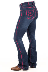 The core range are all crafted on darker denim, and this SR2241 style features hot pink stitch with hearts detail on the front and rear pockets, yoke and outer leg. Very light whiskering at the thigh, and back of the knees. Light spray fronts of the thigh, back thigh and backs of the knees. Tagging detail to the back yoke and hem line. No physical distressing to the denim.
