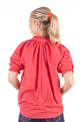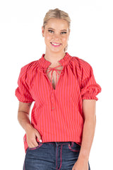 Tailored from a crisp 100% custom dyed cotton, this top is roomy and loose fitting. Frill neckline and tie front. Elasticised short sleeves with frill.