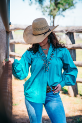 Tailored from a crisp, stretch cotton featuring a rich peacock blue coloured fabric with frill neckline with stair lace at the neckline and shoulder. Full button through garment with a buttoned cuff.