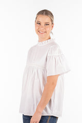 White stretch cotton tailored into the cutest baby doll cut with detailed taping. Frill neckline and single button closure at the back of the garment.