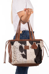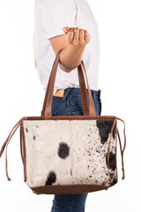 Produced exclusively for H&H, this new style hide and vintage buffalo leather panel handbag is a unique custom design. Short handles for over the forearm or shoulder. Fully lined with custom H&H cotton lining featuring 5 pockets and 1 x zippered pocket for secure storage of personal items. Leather ties for top closure. Decorative ties on each corner that may be tied or left loose. Metal feet to protect the leather underside of the bag.