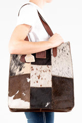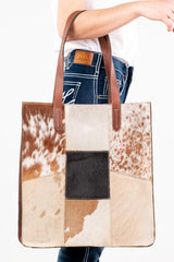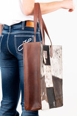 Designed by and produced exclusively for Hitchley and Harrow, this patchwork hide-on shopping tote will carry some serious gear! Leather gusset, base and handles. Fully lined with custom cotton H&H lining. Internal pockets x 2 and zipper x 1. Central top stud closure. Size: 40cms x 37cms x 11ms