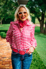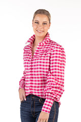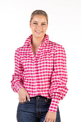 Classic and timeless, this hot pink gingham check linen gathered detail shirt is perfectly at home with tailored pants or jeans. Custom printed for H&H, the shirt bl... Read more