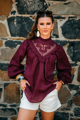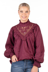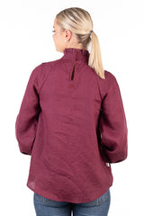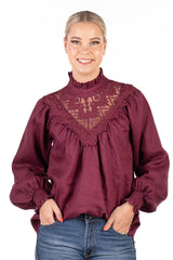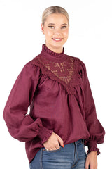 This stunning shirt is tailored from a deep burgundy coloured linen fabric. Roomy and very loose fitting, this shirt is perfect front tucked into jeans or left out over skinny jeans with flats. Shirred elastic cuff with a frill on a longer sleeve allowance which you can wear down, or scrunched up. Frill collar detail and lace overlay at the front. Double button closure at the back of the neckline.