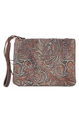 100% Australian made and cotton lined, these embossed leather clutches are the "go to" bag for everyday use or a weekend out. Top single YKK zipper closure with leather pull and leather wrist strap. Features an internal side pocket. Embossed leather front and plain leather back.