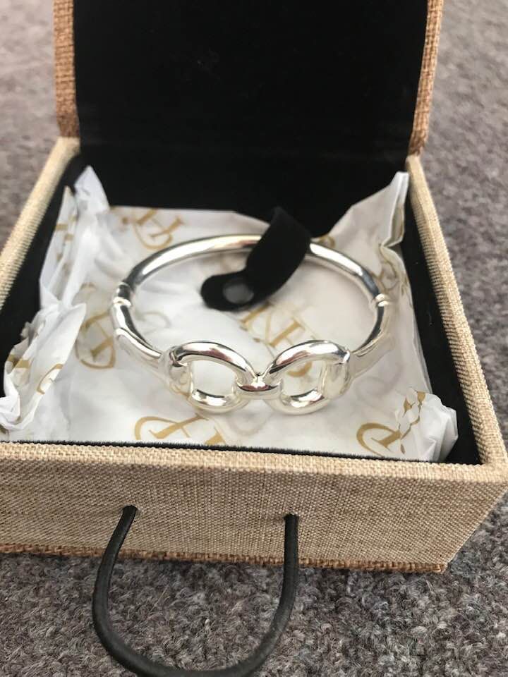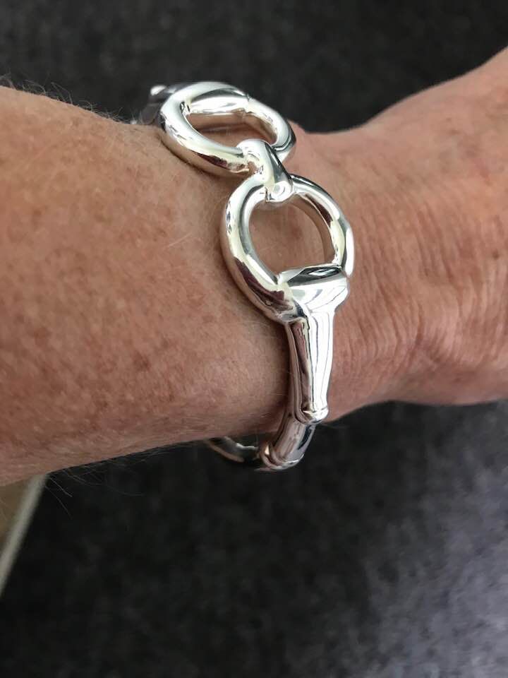 Snaffle bit feature 925 hollow hinged bangle. Stamped 925 and H&H. Oval shaped for maximum comfort. Smooth inner and hammered outer. A spring loaded, hinged bangle - Slip on the most narrow part of the side of your wrist for a comfortable fit. Measurements: Inner width 61mm and inner height 54mm. Width of the bangle: 16.5mm
