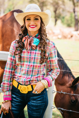Our collared Arena shirt is a classic style with unmistakable H&H fit and finishings. The shirt is manufactured from an absolute statement detailed check featuring hot pink, emerald green, mustard, navy and white. The cuffs and placket are trimmed with a custom printed hot pink and taupe polka dot fabric and finished with a taupe grosgrain with topstitching ribbon. Longer sleeve and body allowance for a perfect fit. Full button though garment with 5", 4 button cuff. 100% Lightweight non-stretch cotton fabric.