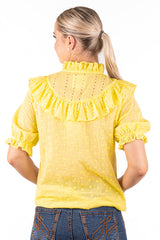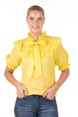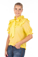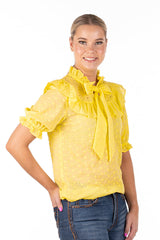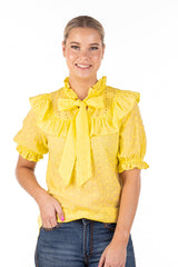 Cute frills with a tie front, this top is tailored from cotton broderie anglaise. Elasticised,  short frill sleeve.