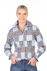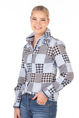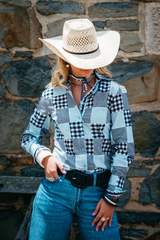 Our collared Arena shirt is a classic style with unmistakable H&H fit and finishings. The shirt is manufactured from an absolute statement detailed patchwork fabric featuring navy and black ginghams and a light chambray blue denim. The cuffs and placket are trimmed with a custom printed pale blue and navy polkadot fabric and finished with a navy grosgrain ribbon. Longer sleeve and body allowance for a perfect fit. Full button though garment with 5", 4 button cuff. 100% Lightweight non stretch cotton fabric.